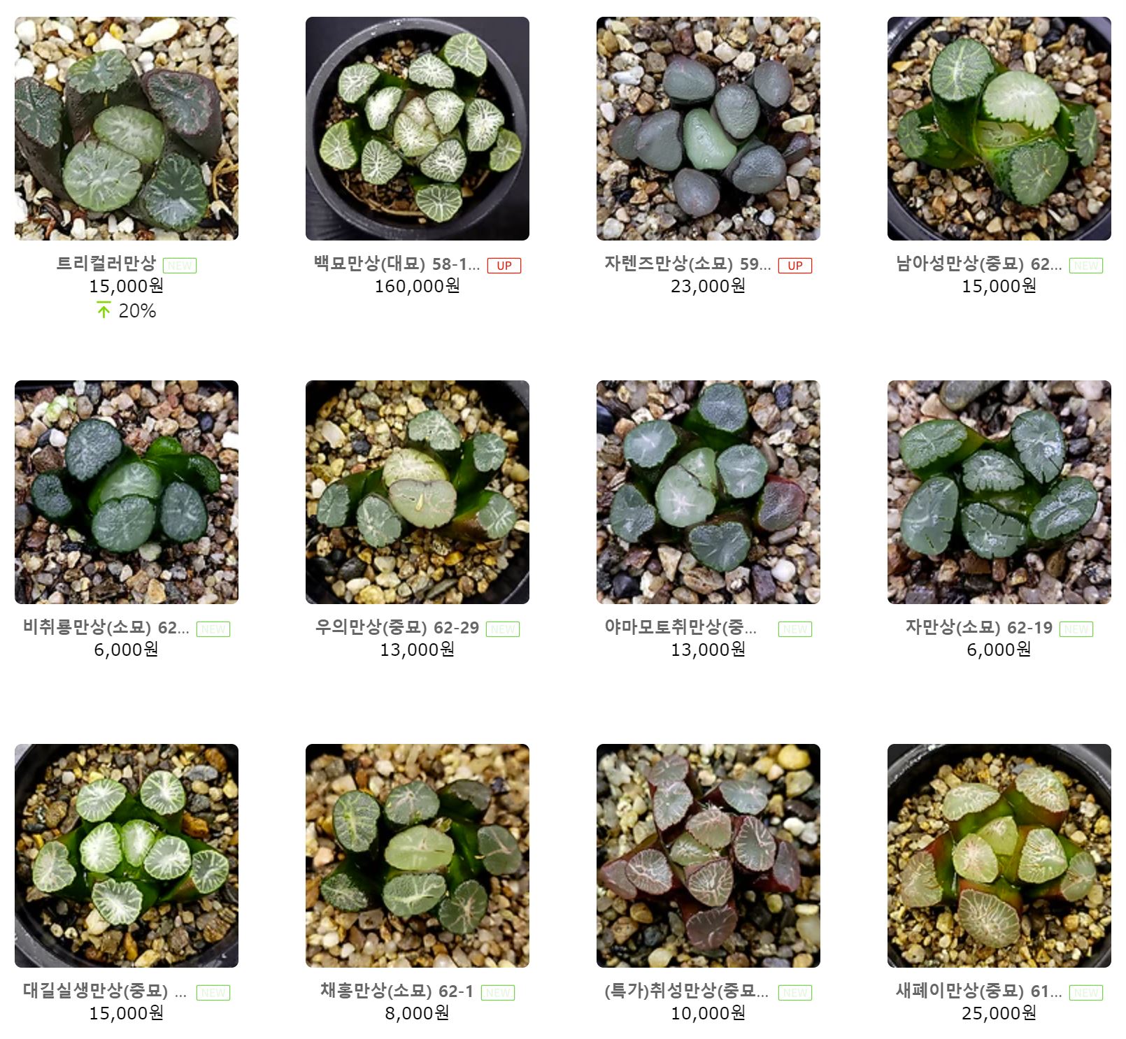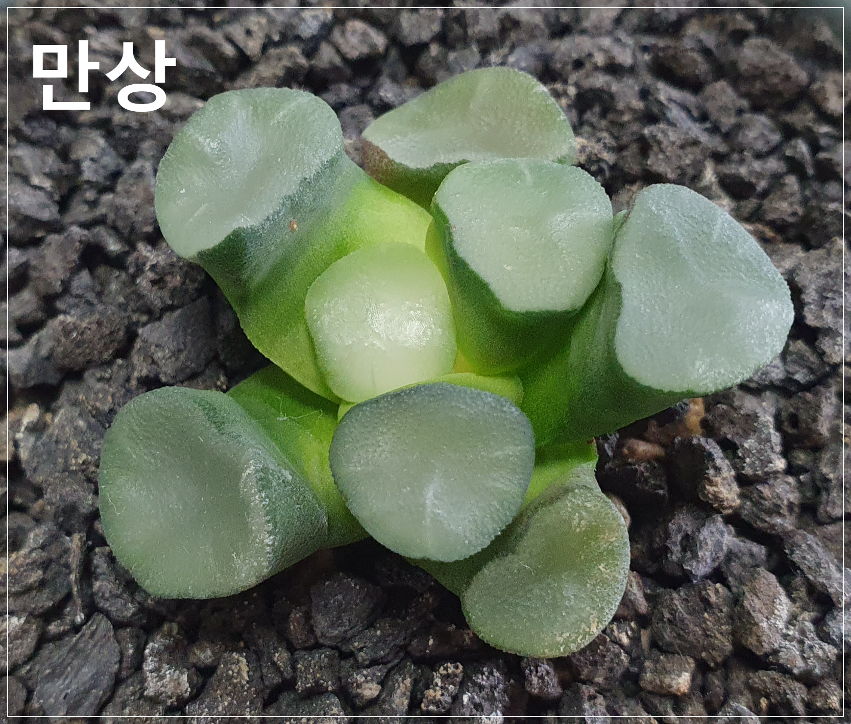 만상은 하월시아 종류 중에 하나다. 많이 팔리는 옵튜샤만큼 인기 있는 품종이라 그런지 시장에 유통되는 물량도 다른 품종에 비해 많아 보인다. 종류도 다양하고 이름도 가지각색으로 팔리고 있다.