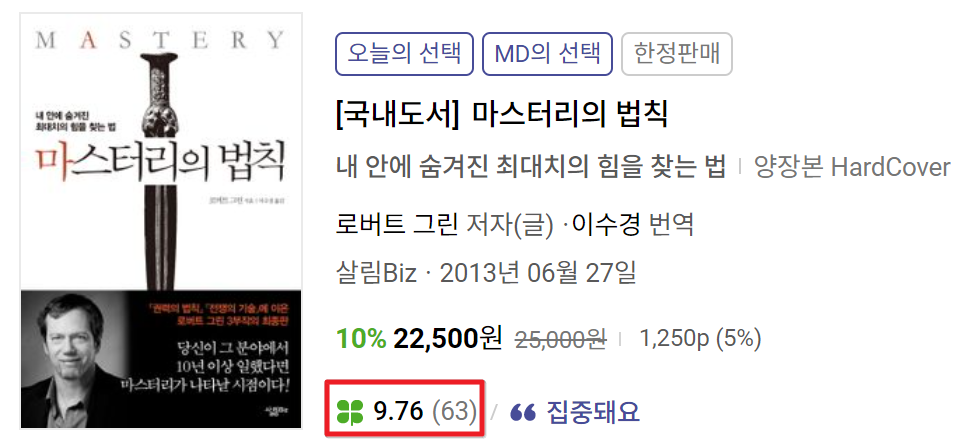 책은 올해 초에 구입했다. 지인의 적극적인 추천을 받아 구입한 책이었다. 지금 내 상황에서 큰 도움이 될 책이라면서 로버트 그린의 마스터리의 법칙을 추천해 주었다. 하지만 사놓고선 끌고 끌다가 이제서야 다 읽게 되었다. 서평을 길지 않게 적당히 남겨보려 한다.